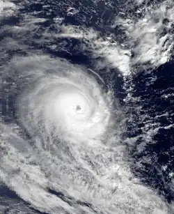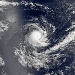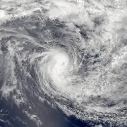 A low-pressure area developed on January 5 near Christmas Island in the Australian basin. Moving westward due to a large anticyclone to the south, it gradually intensified and was named Chris by the BoM. The storm developed an eye on January 9,[16] and that day crossed 90° E into the south-west Indian Ocean.[17] On January 11, the Mauritius Meteorology Service renamed the storm as Damia.[16] On the next day, the Dvorak rating reached 6.0 for the storm,[5] and the MFR estimated peak 10 minute winds of 215 km/h (135 mph), making it an intense tropical cyclone. The agency also estimated a minimum barometric pressure of 898 mbar (26.52 inHg). Damia turned southwestward and slowly weakened; by January 16, the cyclone weakened to tropical storm status, although it reintensified into a tropical cyclone the next day.[17] Around that time, the storm passed about 20 km (12 mi) north of Rodrigues and later approached Mauritius before curving to the south.[5] As a weakened tropical storm, Damia later curved more to the southeast and dissipated on January 23.[17]
