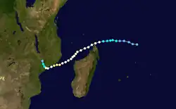 The ITCZ became active in the middle of March northeast of Madagascar, which spawned two low-pressure areas on March 15. The westernmost became a tropical disturbance on the next day between Madagascar and Tromelin. It quickly intensified while tracking to the southwest and was named Justine on March 17. On March 18, the storm intensified into tropical cyclone status and developed a well-defined eye. At 15:00 UTC that day, Justine moved ashore northeastern Madagascar near Sambava. It continued southwestward and weakened over the island, emerging into the Mozambique Channel near Besalampy as a tropical storm. It re-intensified into a tropical cyclone over waters, reaching peak winds of 150 km/h (95 mph) on March 22 only 20 km (12 mi) offshore Mozambique. That day, a ridge over southern Africa steered Justine to the southeast away from land, although the ridge weakened and allowed the storm to move back to the west-southwest. It weakened to a tropical storm during this time. The storm turned again to the southeast on March 24 after the ridge moved to the east. Justine passed north of Europa Island before striking Madagascar again early on March 25 just north of Toliara. It became extratropical over land, and soon again reached open waters while turning to the south. Justine dissipated on March 27 within the flow of the westerlies.[23][24]