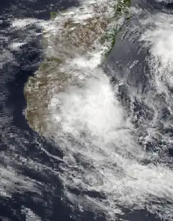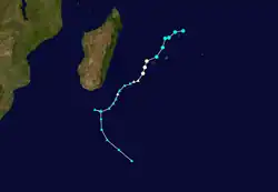 There were three short-lived tropical depressions toward the end of February. The first formed on February 19 about 350 km (220 mi) northeast of Tromelin Island. It moved southward toward Mauritius, bringing several days of heavy rainfall there and Réunion. The depression turned to the west-northwest and dissipated on February 23.[29] That day, the other two depressions formed, including one between Réunion and Madagascar. Given the name Isabeau, it moved westward and dissipated on February 24, reaching winds of only 50 km/h (30 mph).[29][30] The other depression originated in the Mozambique Channel off the southwest coast of Madagascar. On February 24, the system passed south of the island while moving southeastward, bringing wind gusts of 79 km/h (49 mph) at Tôlanaro. It gradually became extratropical, dissipating within the westerlies on February 26.[29] The JTWC classified the system as Tropical Cyclone 20S, estimating 1 minute winds of 85 km/h (55 mph),[31] although it was only officially classified as a tropical depression.[29]