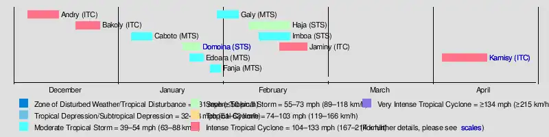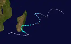 During the season, the Réunion Meteorological Service tracked storms in the basin, using the Dvorak technique to estimate tropical cyclone intensities via satellite imagery.[1] The agency later became Météo-France's meteorological office at Réunion (MFR). At the time, the basin extended from the east coast of Africa to 80° E.[2] Eleven storms were named by the Mauritius Meteorological Service and the Madagascar Meteorological Service.[1] The rest of the naming list was Lalao, Monja, Nora, Olidera, Pelazy, Rija, Saholy, Tsira, Vaosolo, Wilfredy, Yannika, and Zozo.[3] The 11 named storms were slightly above the normal of 9, most of which formed in January and February. There were four intense tropical cyclones, which is twice the average. The increased activity of the season was in part due to enhanced easterlies, a strong monsoon trough, and warm water temperatures around 28 °C (82 °F) which extended to 25° S.[4]