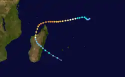 Cyclone Andry reached peak winds of December 9, when MFR estimated winds of 170 km/h (105 mph). The next day, JTWC estimated 1 minute winds of 240 km/h (150 mph).[13] Around that time, Andry was passing just north of the northernmost tip of Madagascar at Diego-Suarez, where the storm produced wind gusts of 250 km/h (155 mph).[1] The cyclone weakened while curving to the southwest and later to the south,[13] making landfall on western Madagascar near Majunga with wind gusts of 198 km/h (123 mph). While over land and turning to the southeast, Andry rapidly weakened into a tropical depression, which later passed near the capital Antananarivo. The storm emerged back into the Indian Ocean on December 14, by which time the system was disorganized.[1] That day, MFR estimated that Andry dissipated, although the JTWC assessed that the system re-intensified slightly and turned sharply southwestward before dissipating over Madagascar on December 16.[13]