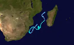 MFR began tracking a tropical disturbance in the Mozambique channel on January 4. The next day, the agency estimated the system intensified into a moderate tropical storm,[18] prompting the Madagascar Meteorological Service to name it Caboto.[1] The storm moved southward along Madagascar's western coast, reaching peak winds of about 65 km/h (40 mph).[18] Caboto made landfall on January 7 to the north of the mouth of the Mangoky River, and crossed the southern portion of the country, emerging near Farafangana into the Indian Ocean. Winds associated with the storm reached 43 km/h (27 mph) at Morondava on the west coast and 63 km/h (39 mph) at Farafangana on the east coast. A developing ridge caused Caboto to slow after it reached open waters, executing a partial loop southwest of Réunion before turning to the south and dissipating on January 10.[1]