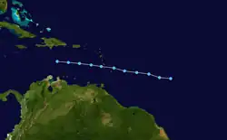 A tropical depression formed about 800 mi (1,285 km) east of the Windward Islands on July 24. Moving west-northwestward, the depression passed between Martinique and Saint Lucia early on the following day.[20] On the latter, the storm dropped up to 8 in (200 mm) of precipitation. The Castries River overflowed its banks, washing away three homes in the eastern section of Castries. Two commercial fisherman were reported missing.[24] Barbados recorded up to 6 in (150 mm) of rainfall in association with the system.[25] The depression entered the Caribbean Sea and failed to intensify further, dissipating about halfway between the Dominican Republic and Venezuela late on July 26.[20]