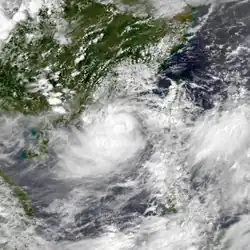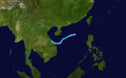 Development of this system was slow within the eastern portion of the monsoon trough. By midday on July 2, the disturbance was first noted about 1,020 kilometres (630 mi) southwest of Guam. The system moved northwest for much of its life cycle, initially following Alex and then the southwest side of the subtropical ridge. A broad tropical depression formed on the afternoon on July 5 within the disturbed weather area, weakening as it passed over Luzon. Late on July 7, ship reports indicated the system had become a tropical storm. The cyclone moved within the radar fence of Hong Kong near its peak intensity before making landfall 250 kilometres (160 mi) to its west-southwest during the early afternoon of July 9. Winds gusted to 70 knots (130 km/h) at Green Island.[1] Weakening over the topography of China was rapid thereafter, and the system dissipated by early on July 10.[6]