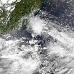 Convection formed in the eastern end of the monsoon trough just north of Guam on August 20, leading to the formation of a weak low-pressure area by late morning August 21. The system slowly consolidated as it moved northwest, and was separating from the monsoon trough on August 23. Although convection increased in organization, the surface wind field did not respond. Nevertheless, it was deemed a tropical depression on the morning of August 24. By the next morning, the surface circulation became exposed as upper-level conditions worsened due to strong southerlies aloft. The cyclone was no longer deemed tropical at that time. The surface cyclone moved northwest, crossing the Ryūkyū Islands before it merged with a frontal zone in the northern East China Sea late on August 26.[14]
