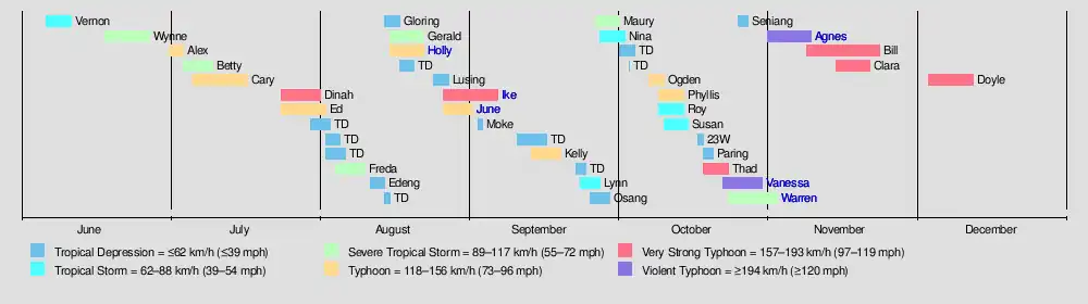 Despite its late start, a total of 30 tropical depressions formed this year in the Western Pacific, of which 27 became tropical storms. A total of 16 storms reached typhoon intensity, of which 2 reached super typhoon strength. Three of the systems formed in June, four in July, seven in August, four in September, eight in October, three in November, and one in December. Eight tropical cyclones moved into mainland China, four struck Vietnam, four moved through the Philippines, and one cyclone moved into South Korea. The most damaging and deadly typhoon this season was Ike, which led to significant damage and two-thirds of the overall seasonal death toll, mainly from the Philippines. The longest lived cyclone was Bill, which persisted for two weeks during mid November. Despite the eight tropical cyclones moving into China, Hong Kong received only 18 percent of its annual rainfall from tropical cyclones, which was 35 percent below the annual average.[1]