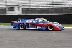 Jaguar Cars had been impressed with the strong effort in the past seasons by the American Group 44 Racing team of Bob Tullius. The company thought a full works effort was viable, but instead chose to ally with Tom Walkinshaw Racing - who had latterly been running the Jaguar XJ-S in the ETCC (European Touring Car Championship).[14][15] Designer Tony Southgate (who had worked with Shadow, Lotus and Theodore in F1) had produced the new XJR-6 model and it had run in the latter-half of last season. In the close-season, much work was done to simplify and lighten the key components.[14] The twin-valve 6.0-litre V12 engine had a single-overhead camshaft, with a 60 degree cylinder angle. TWR's engine-specialist, Allan Scott, could tune the engine to 630 bhp, with a top speed of 370 kp/h (230 mph).[14] It was fitted to a March-Hewland gearbox with the suspension running large 19" wheels, and the longtail body-styling gave it 70% more downforce than the Porsches.[8] The season drivers were current F1 drivers Eddie Cheever/Derek Warwick, and Jean-Louis Schlesser/Gianfranco Brancatelli (current ETCC champion). For Le Mans, Schlesser joined the first car, and TWR driver Win Percy joined Brancatelli in the second. A third car had former Group 44 teammates Brian Redman and Hurley Haywood, with Hans Heyer. The team had an excellent lead-up, with Warwick and Cheever winning the Silverstone round, and then Cheever throwing down the gauntlet to Porsche with the fastest times at the test-day.[16][8][15]