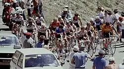 The night before stage 18 to Alpe d'Huez, Hinault called a team meeting, complaining about the fact that Zimmermann now split the two La Vie Claire riders. He called for the team to attack Zimmermann the following day, "until he was broken". Another dispute broke out with LeMond, who pointed out that with a time trial still to come, a discipline that did not favour Zimmermann, there was no need for an all-out attack.[71] Tapie had to talk to the riders until four o'clock in the morning to handle the situation.[72] Shortly after the start of the stage in Briançon, the first climb of the day was the Col du Lautaret. A breakaway formed, including Herrera and Winterberg, who left their companions on the following climb, the Col du Galibier. Behind them, in the group of favourites, Zimmermann was closely guarding LeMond, while Hinault made several small accelerations to test the opposition. On the descent of the Galibier, Hinault attacked, only 150 km (93 mi) into the stage. He caught Herrera and Winterberg and they were joined by LeMond, Bauer and Ruiz Cabestany. As they reached the next small climb, the Col du Télégraphe, Hinault attacked again, going clear on his own. LeMond, having strict instructions from his team not to work with Zimmermann, was again stuck behind. LeMond dropped back to his team car for instructions by coach Paul Köchli, who urged him to attack Zimmermann instead of leading him towards Hinault, who at that point had a lead of about one-and-a-half minutes. LeMond attacked shortly before the summit and opened up a gap to Zimmermann on the descent, eventually catching up to Hinault, together with Bauer and Ruiz Cabestany. Bauer then did the lead work until the foot of the next climb, the Col de la Croix de Fer, where he dropped back. Ruiz Cabestany fell behind soon after.[73] On the ascent, Hinault asked LeMond to ease the tempo, due to his aching knee, and set the pace himself. By the summit, they led Zimmermann by 2:50 minutes. On the descent, both set a high tempo, extending the lead over Zimmermann to 4:30 minutes as they reached the climb of Alpe d'Huez.[74] Sensing that the French public, clearly favouring Hinault, made LeMond nervous,[75] the former led all the way up the climb, with both riders steadily increasing their advantage over everybody else.[76] Close to the finish line, LeMond drove alongside Hinault, putting his arm around him for a short conversation. At the finish, Hinault took LeMond's hand in an apparent gesture of comradery and they crossed the line together, with Hinault taking the stage win.[74][77] Tapie later revealed that he had orchestrated the moment, having told LeMond before the climb to Alpe d'Huez that he had effectively won the race and that he should let Hinault take the stage.[78] Zimmermann finished third, 5:15 behind the pair.[75]