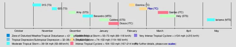 Cyclone Filao was the most notable storm of the season, originating in late February off northern Madagascar. It ultimately struck Mozambique on March 1, where it killed about 100 people and left $10 million in damage (1988 USD). In January, both tropical storms Calidera and Doaza crossed Madagascar, the latter of which helped end a drought. Long-lasting Tropical Storm Hely also struck the country in March. The strongest cyclone of the season was Gasitao, which formed at the same time as Hely and attained peak winds of 150 km/h (93 mph). The season ended when Tropical Storm Iarisena dissipated northeast of Madagascar in the middle of May.