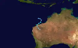 On 23 February the BoM started to monitor a tropical low that had developed within the monsoon trough about 1,665 km (1,035 mi) to the north of Perth, Western Australia.[9][10] Over the next day the system moved southwards before it was designated as Tropical Cyclone 16S by the JTWC, as it reached its peak intensity with 1-minute sustained wind speeds of 85 km/h (55 mph).[10][11] The system subsequently made landfall on Western Australia during 24 February, having nearly become a tropical cyclone on the Australian scale.[9] The system was subsequently last noted over Western Australia during 25 February.[9]