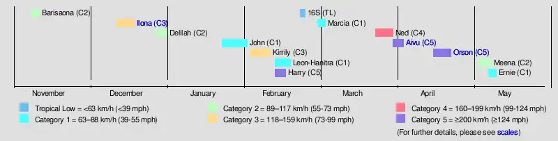 | Barisona | 5–11 November | Category 2 tropical cyclone | 95 km/h (60 mph) | N/A | None | None | None | |