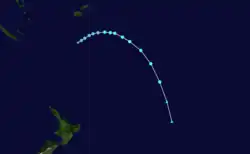 On January 1, Tropical Cyclone Delilah moved into the South Pacific basin from the Australian region, as a category 1 tropical cyclone on the Australian scale.[8] During that day as the system continued to intensify and move south-eastwards towards New Caledonia and the Loyalty Islands, the JTWC initiated advisories on the system and designated it as Tropical Cyclone 04P.[9][10] During January 2, as the system passed about 20–30 mi (30–50 km) of the northeastern coast of New Caledonia, the JTWC and the FMS reported that the system had peaked with sustained windspeeds of 110 km/h (70 mph).[8][10] During the next day Delilah started to weaken and transition into an extra tropical cyclone, as vertical wind shear over the system increased and the upper level westerlies intensified.[1][9] The system subsequently became an extra tropical cyclone during January 4, and started moving southwards towards New Zealand.[1] The system subsequently passed close to northern New Zealand during January 7, before it merged with a cold front during January 8.[1][9]