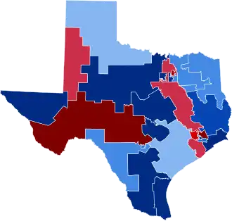 Democrats maintained their majority of U.S. House seats from Texas, flipping two seats from the Republicans, increasing their majority to nineteen out of twenty seven seats.[2]