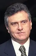 Popular Governor of Alagoas Fernando Collor de Mello resigned from his position to mount a bid for the presidency.[3] Previously a member of the PMDB, Collor joined the small National Reconstruction Party (PRN) in the run-up to the presidential campaign. Collor, who presented himself as a political outsider and was noted for his charisma,[4] polled at a mere 5% according to polling taken in early 1989.[5] Collor's emergence as an unlikely frontrunner was credited to his campaign's skilled use of television advertisements to make the case for his candidacy.[6] Collor, who had governed one of the smallest states in the country, chose Senator Itamar Franco of the populous and electorally crucial state of Minas Gerais as his running mate.[7] Further, Collor's campaign was noted for his relative youth at the mere age of 40.[8]