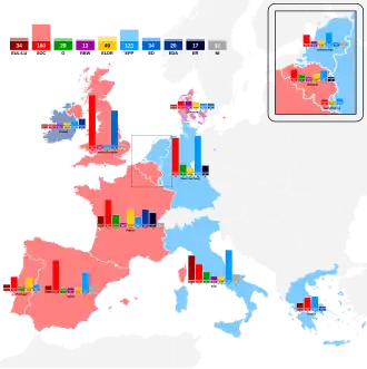 EPP Christian Democrats West Germany 32, Belgium 7, Denmark 2, France 6, Ireland 4, Italy 27, Luxembourg 3, Netherlands 10, UK 1, Greece 10, Spain 16, Portugal 3 23% 121