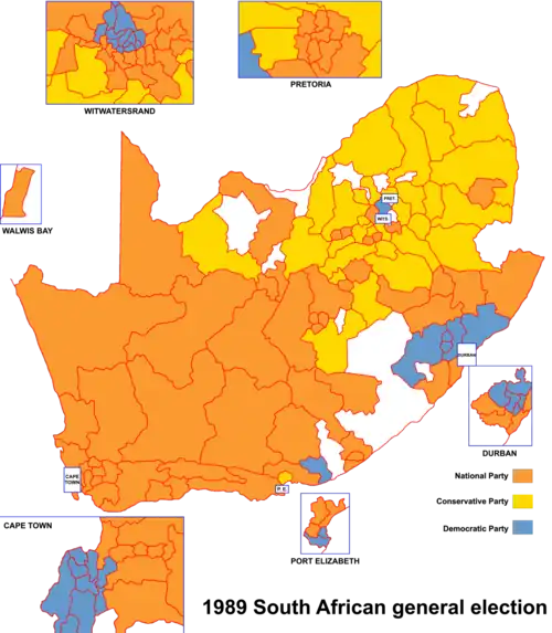 General elections were held in South Africa on 6 September 1989, the last under apartheid. Snap elections had been called early (no election was required until 1992) by the recently elected head of the National Party (NP), F. W. de Klerk, who was in the process of replacing P. W. Botha as the country's president, and his expected program of reform to include further retreat from the policy of apartheid. The creation of the Conservative Party had realigned the NP as a moderate party, now almost certain to initiate negotiations with the black opposition, with liberal opposition (the PFP) openly seeking a new constitutional settlement on liberal democratic and federalist principles.