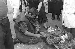 While increasing the blockade around Tbilisi, Tengiz Sigua and Tengiz Kitovani offer a peace proposal to Gamsakhurdia on 24 December. The plan offers to treat members of government with safe conduct in exchange of the immediate resignation of the President, an offer refused by the head of state.[70] At the end of the day, some international reports estimated the number of dead between 23 and 50 Georgians and 168 to 200 injured. Russian television shows footage of civilians evacuating the bodies of victims during the evening.[70] On 25 December, the number of dead grows to 30–80 victims, according to US media.[73]