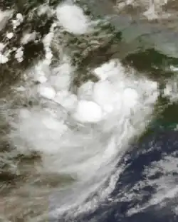 During July 27, a depression developed over the northern Bay of Bengal to the east of the Indian state of Odisha.[2][4] Over the next day the system moved westwards and developed into a Deep Depression, as it made landfall near Badudebpur in Odisha with estimated winds of 55 km/h (35 mph).[4] The system dissipated over East Rajasthan during July 31, as it enhanced monsoon activities over northern and eastern India.[4]