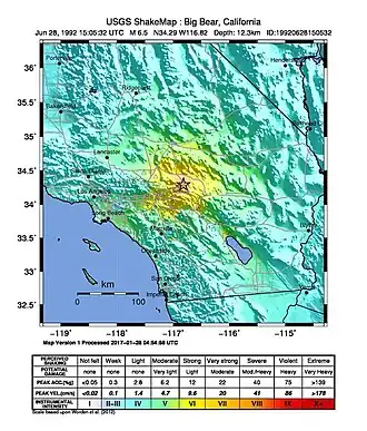 The 1992 Big Bear earthquake occurred at 08:05:33 PDT on June 28 in Big Bear Lake, California, with a moment magnitude of 6.5 and a maximum perceived intensity of VIII (Severe) on the Mercalli intensity scale. The earthquake occurred at a relatively shallow depth of 5 kilometers (3.1 mi).