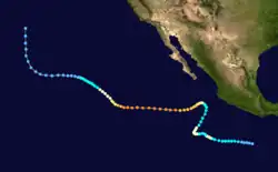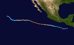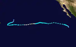 During the season, twenty-seven tropical cyclones formed in the Eastern Pacific (east of longitude 140°W), and twenty-four developed further and became tropical storms. Both of these figures constitute records in the basin, as the 1992 season surpassed the season with the most tropical cyclones (1982, 26) and the season with the most named storms (1985, 22). Of these, fourteen reached hurricane strength and eight became major hurricanes—storms that reach Category 3 or higher on the Saffir-Simpson Hurricane Scale.[5]
