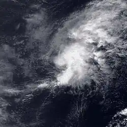 A tropical wave crossed Central America from June 14–16. The system entered the Eastern Pacific basin without much convection. The northward portion of the wave developed a circulation in the mid-levels of the atmosphere, and despite moving over waters marginally suitable for cyclogenesis, the tropical wave organized into the fourth depression of the season on June 22[13] as deep convection developed near the center.[14] At this time, the system was located 460 mi (740 km) south of the southern tip of the Baja California Peninsula.[13] Early on June 23, the depression intensified into Tropical Storm Blas. Although the storm developed an impressive upper-level outflow and well-organized thunderstorm activity and was moving into an area sea surface temperatures of 78 °F (26 °C), the National Hurricane Center (NHC) forecast only slight intensification.[15] Water vapor imagery also suggested that strong wind shear would introduce a weakening trend,[16] and later that day, Blas weakened accordingly back into a depression, and dissipated at 00:00 UTC June 24.[13]