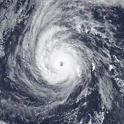 Late on July 15, Hurricane Frank passed about 175 mi (282 km) south of Socorro Island. A station on the island reported winds of 67 mph (108 km/h), which indicated that the hurricane had a large wind field.[42] Slow intensification continued, and Frank intensified into a major hurricane, or a Category 3 on the Saffir-Simpson Hurricane Scale, on July 17.[6] By that time, the eye had become well-defined,[43] and later became surrounded by a ring of deep convection. On July 18, Frank reached its peak intensity of 145 mph (233 km/h) well to the west-southwest of the Baja California peninsula.[44] By July 20, winds dropped below major hurricane intensity, and by the evening, Frank was just a Category 1 hurricane.