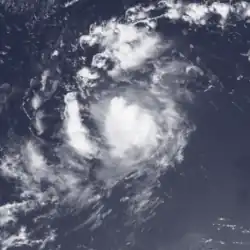 The origins of Hurricane Estelle were from a tropical wave that began on June 23 off the African coast.[29] After passing over northern South America, a large area of disturbed weather formed about 460 mi (740 km) west of Acapulco on July 9 and was classified as a tropical depression two days later. Eighteen hours later, the depression strengthened into Tropical Storm Estelle[29] as banding features increased.[30] Gradually intensifying, the storm's outflow improved,[31] and a burst of deep convection occurred over the center.[32] Early on July 10, an eye developed, and based on this, Estelle was upgraded into a hurricane. Around that time, Estelle turned to the northwest.[29]