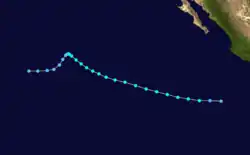 Although the eye briefly disappeared from satellite imagery later that day,[33] a small and distinct eye quickly re-formed within very deep convection, and Estelle was respectively upgraded into a Category 2 hurricane.[34] Later on July 11, the NHC reported that Estelle had intensified into a major hurricane.[6] A few hours later, Estelle was upgraded into a Category 4 system as the storm continued to rapidly deepen.[35] Moving northwestward due to interaction with a trough,[36] Estelle began a weakening trend. By the afternoon, Estelle was downgraded into a Category 3 system. At 00:00 UTC, winds fell below major hurricane force, only to re-intensify back to a major hurricane hours later.[6] Hurricane Estelle quickly re-developed a well-defined eye and an impressive upper-level outflow[37] and Estelle attained its peak intensity of 140 mph (230 km/h).[6] However, the next day the thunderstorms around the eye began to warm.[38] The storm gradually weakened over the next few days as it encountered cooler waters.[29] By early on July 14, Hurricane Estelle was re-classified as a Category 3 hurricane, and shortly afterwards, winds fell below major hurricane strength several hundred miles west of the Baja California Peninsula.[6] Turning west under shallow low-level steering currents,[29] Estelle weakened into a tropical storm on July 15. It weakened into a tropical storm the next day. On 08:00 UTC July 17, Tropical Depression Estelle had dissipated over 1,000 mi (1,610 km) west of Baja California Sur.[6]
