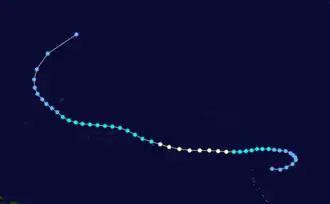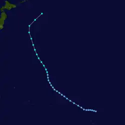 Early the next day, Bobbie intensified into a severe tropical storm.[9] At that time, the JTWC claimed that Bobbie had intensified into a typhoon,[9] while the JMA noted that Bobbie had actually became a typhoon several hours later.[5] On 18:00 UTC on 26 June, Bobbie peaked with 1-minute sustained winds of 140 mph (220 km/h) as it tracked the western extent of the mid-level subtropical ridge.[9] Several hours later, Bobbie peaked with 10-minute sustained winds of 105 mph (165 km/h).[5] As Bobbie began recurving east of Taiwan at 12:00 UTC that day, increasing southwesterly winds caused Bobbie to steadily weaken. Passing over Miyako Jima on 28 June and then just southeast of Okinawa on 29 June, Bobbie began undergoing an extratropical transition on at that time.[9] At that time, Bobbie weakened into a severe tropical storm as it left the PAR, causing PAGASA to stop issuing advisories on the storm.[9] As Bobbie transitioned into an extratropical storm, the JTWC issued their final warning on the system the next day, prior to it brushing the southern tip of Honshu.[9] The JMA noted that Bobbie became extratropical early the next day, prior to it dissipating on 3 July.[5]