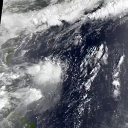 On 2 January, stronger-than-normal low-level westerlies were observed east of New Guinea. As a result of these increased winds and an area of cloudiness, two areas of convection on different sides of the equator formed. The next day, these areas began consolidating.[4] As a result, on 4 January, the Japan Meteorological Agency (JMA) noted that the northern area of convection had developed into a tropical depression.[5] Several hours later, the Joint Typhoon Warning Center (JTWC) issued a Tropical Cyclone Formation Alert (TCFA) on the depression, issuing their first warning on Tropical Depression 01W later that day.[4] Early on 6 January, both the JTWC and JMA had noted that the tropical depression had intensified into a tropical storm,[5][4] causing the former agency to name it Axel.[4]