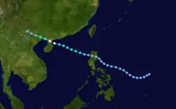 In Vietnam, at least 21 people died and while 80 were reported missing.[15] Intense winds uprooted over 500 trees, downed electrical cables and damaged about 140 houses in Hanoi. As a result of the storm, in the capital alone, three people were killed while another three were injured. Massive waves engulfed several coastal fishing villages in Cát Hải district, with seven people being missing there.[17] Elsewhere, in Hainan, one person died.[16] In the Philippines, combined with the effects of nearby Bobbie, heavy rainfall would produce mudflows in the Philippines. These poured down the Bucao, Balinquero and Maraunot rivers, causing them to rise up 6 ft (1.8 m).[12] Economic losses in Hainan are estimated at 223 million RMB (US$40.5 million).[18]