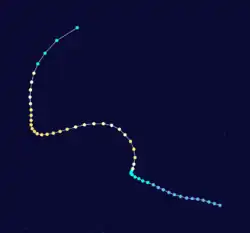 On 3 February, a weakening Tropical Storm Ekeka tracked west of the International Date Line, entering the West Pacific basin and being monitored by the JMA.[5] Early the next day, the JTWC began issuing bulletins on Ekeka, which was in an environment with high wind shear.[7] Later that same day, Ekeka weakened into a tropical depression.[5][7] Several days later, on 8 February, the JMA stopped tracking the depression.[5] The JTWC kept tracking Ekeka for a few hours until it passed over Chuuk.[7] Early on February 9, Ekeka finally dissipated about 800 miles (1,300 km) east-southeast of Palau, or about 310 miles (500 km) off the north coast of Papua New Guinea.[8]