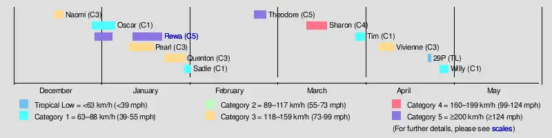 | Rewa | 26 December – 23 January | Category 5 severe tropical cyclone | 205 km/h (125 mph) | 920 hPa (27.17 inHg) | Melanesia, Eastern Australia, New Zealand | Unknown | 22 | |