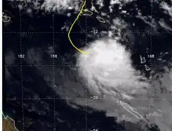 On 20 April, the JTWC started to monitor an area of low pressure that located over the Solomon Islands about 155 km (95 mi) to the north of Honiara.[12] During that day the disturbance moved towards the southeast and passed over several of the Solomon Islands, before emerging into the Australian basin.[12] Over the next couple of days the disturbance gradually developed further while moving towards the southwest before re-curving and moving southeastwards.[12] On 24 April, as it moved back into the South Pacific basin, the JTWC initiated advisories on the disturbance, designating it as Tropical Cyclone 29P, with peak windspeeds equivalent to a tropical depression.[12][13] As the system was classified, it recurved again and started to move slowly towards the northwest, and started to feel the effects of a high amount of vertical windshear.[12][13] As a result of the windshear, the center became exposed and displaced from the deep convection before the JTWC issued their final advisory on 25 April as 29P weakened into an area of low pressure, before dissipating later that day about 600 km (375 mi) to the southwest of Honiara.[12][13]