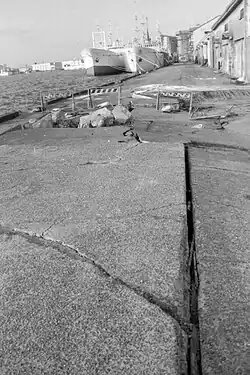 A peak ground acceleration of up to 922 cm/s² was recorded at Kushiro that lasted 30 seconds which caused extensive soil liquefaction and damage to the city.[13] In the city, six homes collapsed while 590 were affected, 33 of them sustaining serious damage. Further destruction of properties resulted from landslides and slope failures, some posing additional threats even after the earthquake. During one of the many landslides, a house slid ten meters down the slopes of a hill. The port area was also destroyed by liquefaction, buried manholes and sewage pipes were uplifted and erupted from the ground by up to 1.5 meters.[14] Uplift was observed along a 200-meter zone.[15] Two people were killed; one died from a falling ceiling light, the other was poisoned by gas. Sixty-one individuals were badly injured while another 661 had received minor injuries.[16]