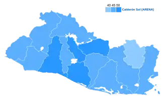 General elections were held in El Salvador on 20 March 1994, with a second round of the presidential elections taking place on 24 April. Armando Calderón Sol of the Nationalist Republican Alliance won the presidential elections, whilst his party also won the legislative elections. Voter turnout was 52.27% in the first round of the presidential elections and 45.51% in the second, whilst it was 53.08% for the legislative election.[1]