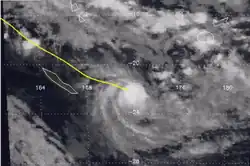 On March 9, the FMS started to monitor a tropical depression had developed within an active convergence zone, about 150 km (93 mi) to the northwest of Nouméa, New Caledonia.[8] During that day an upper-level trough moved over New Zealand which brought the jet stream over New Caledonia. As a result, this made the depression hard to locate with satellite imagery.[8] However, later that day despite the system being poorly organized, the FMS reported that the depression had intensified into a tropical cyclone and named it Zaka.[8] As they named it RSMC Nadi reported that the system had reached its peak 10-minute sustained windspeeds of 65 km/h (40 mph) with further development of the system restricted by strong vertical wind shear.[8][14] Early on March 10, the JTWC designated Zaka as Tropical Cyclone 20P, while it had its peak 1-minute windspeeds of 75 km/h (47 mph).[3] The FMS then issued their final advisory at 0600 UTC, as Zaka had weakened into a tropical depression and was moving into TCWC Wellingtons area of responsibility.[8][14] TCWC Wellington and the JTWC monitored Zaka for another day before it was last noted during March 11 as it became an extratropical cyclone.[14][15] Zaka dumped 376 mm (14.8 in) of rain on Vanuatu in just 24 hours.[16]