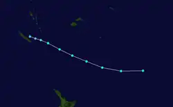 On March 4, the JTWC started to monitor an area of disturbed weather that had developed within the Australian region about 900 km (560 mi), to the southeast of Port Moresby in Papua New Guinea.[17] Over the next few days, the system remained weak and gradually moved southeast before it crossed 160°E and moved into the basin on March 9.[17] During the next day, both the JTWC and the FMS started to monitor the system as a tropical depression as it moved through the Loyalty Islands.[17] On March 11, the depression intensified into a tropical cyclone as it moved southeastward, prompting the FMS to name it Atu at 1800 UTC.[8] Early on March 12, the JTWC reported that Atu had reached its peak 1-minute windspeeds of 100 km/h (62 mph). Later that morning the FMS reported that Atu had reached its peak 10-minute sustained windspeeds of 85 km/h (53 mph).[17] After it had peaked in intensity, Atu weakened under the influence of strong vertical windshear before the JTWC and the FMS issued their final advisories during March 13, as Atu had become extratropical.[3][8] Atu's remnants were then monitored by the FMS and MetService until they dissipated on March 18.[17]