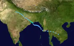 The storm originated from the monsoon trough on November 7 in the Bay of Bengal, east of India. Moving northwestward, the system gradually intensified while moving toward land, eventually developing an eye in the middle of the convection. Reaching peak 3 minute winds of 120 km/h (75 mph), the IMD classified the system as a very severe cyclonic storm, in line with the 130 km/h (80 mph) wind estimate from the JTWC. On November 9, the cyclone made landfall near the border of Andhra Pradesh and Orissa.[2][3] Atypical for most November storms, the system continued to the north and dissipated over Nepal on November 11.[2][16]