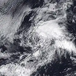 On May 15 an area of disturbed weather in the Intertropical Convergence Zone developed into a tropical depression. The disturbance was not readily traceable back to a tropical wave from the Atlantic. On its first day of its existence, Tropical Depression Two-E was a well-organized system with maximum sustained winds of 35 mph (56 km/h) and a minimum central pressure of 1,006 mbar (29.7 inHg).[15] As it slowly moved west, Two-E experienced a few intermittent bursts of convection. However, the depression gradually became less organized during the remainder of its life. On May 18, the cyclone's organization deteriorated markedly until it dissipated the next morning.