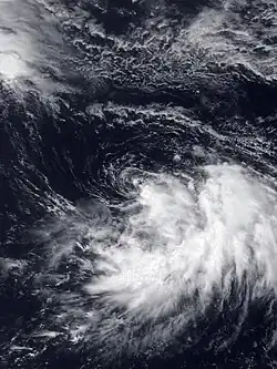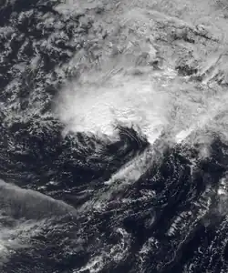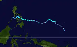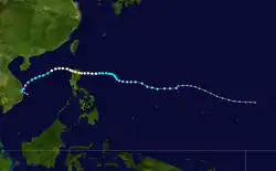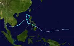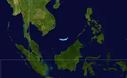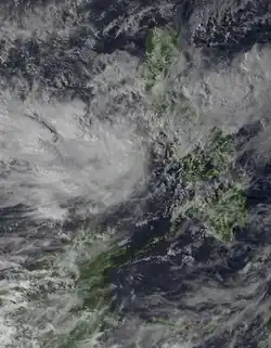 On February 23, a large area of convection developed south of the Philippine Sea. The convection developed into a low pressure area and was at first bombarded by wind shear, but conditions soon turned favorable which allowed it to strengthen rapidly on February 27 before becoming a Tropical depression later that day. The JMA upgraded 01W into a Tropical Storm before it drifted over the Philippines on February 29, and weakened slightly due to land interaction.[2][3] On March 1, a cold front brought cold, dry air and vertical wind shear which pushed the system south caused the system's low level circulation center to become exposed. The exposed remnants of 01W continued to drift south, before being completely absorbed by the Intertropical Convergence Zone.