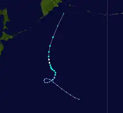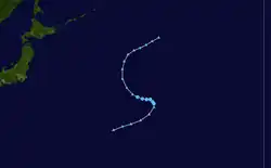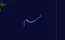A monsoon depression developed on July 28 over the open Pacific Ocean. It headed northwestward, slowly consolidating to become a tropical storm on the 5th. While south of Japan, Kirk drifted to the southeast and looped back to the west, strengthening to a typhoon on the 8th while looping. It continued slowly northwestward, and while curving to the northeast Kirk reached a peak of 110 mph winds. The typhoon struck southwestern Japan at that intensity on the 14th. It weakened over the country, and dissipated on the 16th over the northern Pacific. Kirk caused heavy flooding, resulting in at least 2 deaths and ¥20.6 billion (US$189 million) in damage.[4][5]