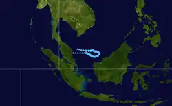 Two active monsoon troughs that also developed Typhoon Fern and Southern Hemisphere Cyclones Ophelia, Phil, and Fergus spawned Tropical Depression 43W in the South China Sea on December 21. Due to the troughs' nature, the depression headed east-southeastward, where it strengthened into the final tropical storm of the year on the 24th; Greg. After reaching a peak of 45 knots (83 km/h) winds it crossed the northern part of Borneo on the 25th. It continued east-southeastward until dissipation on the 27th, south of the Philippines. Greg caused extensive property damage on Borneo from torrential flooding, resulting in 127 deaths and 100 people missing.[4]
