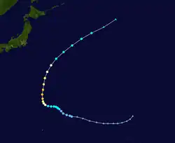 By July 10, increasing vertical wind shear and cooler ocean temperatures initiated weakening. Dan decelerated to a tropical storm by July 11 near the Ryukyu Islands, Japan. The system subsequently turned northeastward, transitioning into an extratropical cyclone by July 12 before dissipating over the open North Pacific.