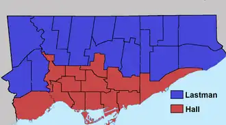 The mayoral race saw incumbents from the two largest former cities run to be mayor, the left-leaning Barbara Hall and the right-leaning Mel Lastman. Lastman won the election by a narrow margin, around 40,000 votes.