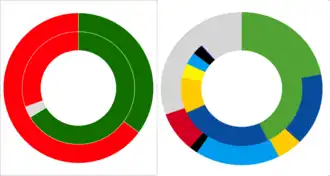 Ring charts of the election results showing popular vote against seats won, coloured in green (Pro-democracy camp) and red (Pro-Beijing camp) on the left and the party colours on the right. Seats won in the election (outer ring) against number of votes (inner ring).