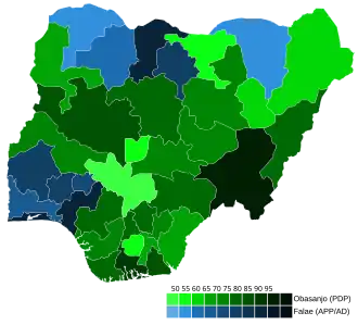Presidential elections were held in Nigeria on 27 February 1999. These were the first elections since the 1993 military coup, and the first elections of the Fourth Nigerian Republic. The result was a victory for Olusegun Obasanjo of the People's Democratic Party, who defeated Olu Falae, who was running on a joint Alliance for Democracy-All People's Party ticket.[1] Voter turnout was 52.3%.