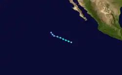 A tropical wave moved off the coast of western Africa into the Atlantic Ocean on August 29. It continued to move westward through the tropical waters of the Atlantic into the Caribbean. It still remained a tropical wave as it moved over Central America and began to acquire more convection and organization, from September 10 through September 11. Visible satellite imagery showed low level circulation and more organized deep convection as it became a tropical depression on September 17, while located about 475 miles (764 km) south-southeast of the southern tip of the Baja California Peninsula.[30]