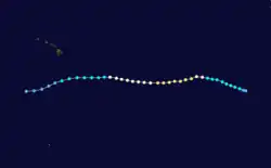 Dora weakened to Category 1 strength as it entered the Central Pacific Hurricane Center's area of responsibility on August 14. However, it briefly restrengthened into a Category 3 as it passed south of Hawaii on August 16. Dora then began weakening for the final time as it passed south of Johnston Atoll on August 18.[20] At the atoll, Dora produced large waves and wind gusts between 40 and 45 mph (64 and 72 km/h).[5] In Hawaii, heavy surf on the Big Island forced the closure of beaches, campsites, and hiking trails in the districts of Kau and Puna.[21] On August 20, Dora crossed the International Date Line,[5] while weakening to a tropical storm. Due to vertical wind shear, it did not re-strengthen in the western Pacific basin. The storm weakened more, falling to tropical depression intensity early on August 22. Dora dissipated late on the following day, while situated several hundred miles east of Wake Island.[20]