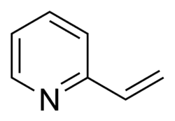 2-Vinylpyridine is an organic compound with the formula CH2CHC5H4N. It is a derivative of pyridine with a vinyl group in the 2-position, next to the nitrogen. It is a colorless liquid, although samples are often brown. It is used industrially as a precursor to specialty polymers and as an intermediate in the chemical, pharmaceutical, dye, and photo industries.[1] Vinylpyridine is sensitive to polymerization. It may be stabilized with a polymerisation inhibitor such as tert-butylcatechol. Owing to its tendency to polymerize, samples are typically refrigerated.